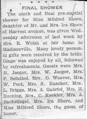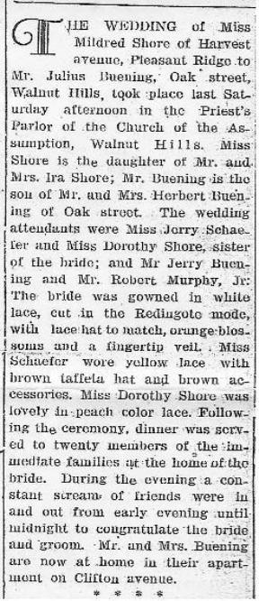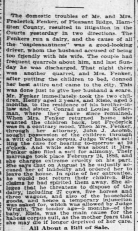 | Mike Shore found this article in the Cincinnati Enquirer dated August 23, 1895. Mr. & Mrs. Frederick Fenker were the maternal grandparents of my Mom, Mildred ‘Sis’ Shore Buening. They had two more children (one was Aunt Helen) so I assume they did not get divorced. ================= [If you have a hard time reading this, click here for my typed version.] |